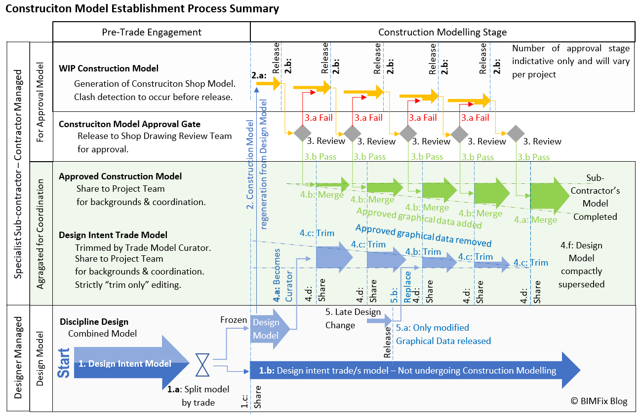 During the construction modeling stage; graphical data will undergo several transitions. The design Intent graphical data may be complete, but changes can still occur, while; the specialist sub-contractor is authoring their Construction Shop Model for approval, and the approved Construction model is undergoing fabrication/construction.
